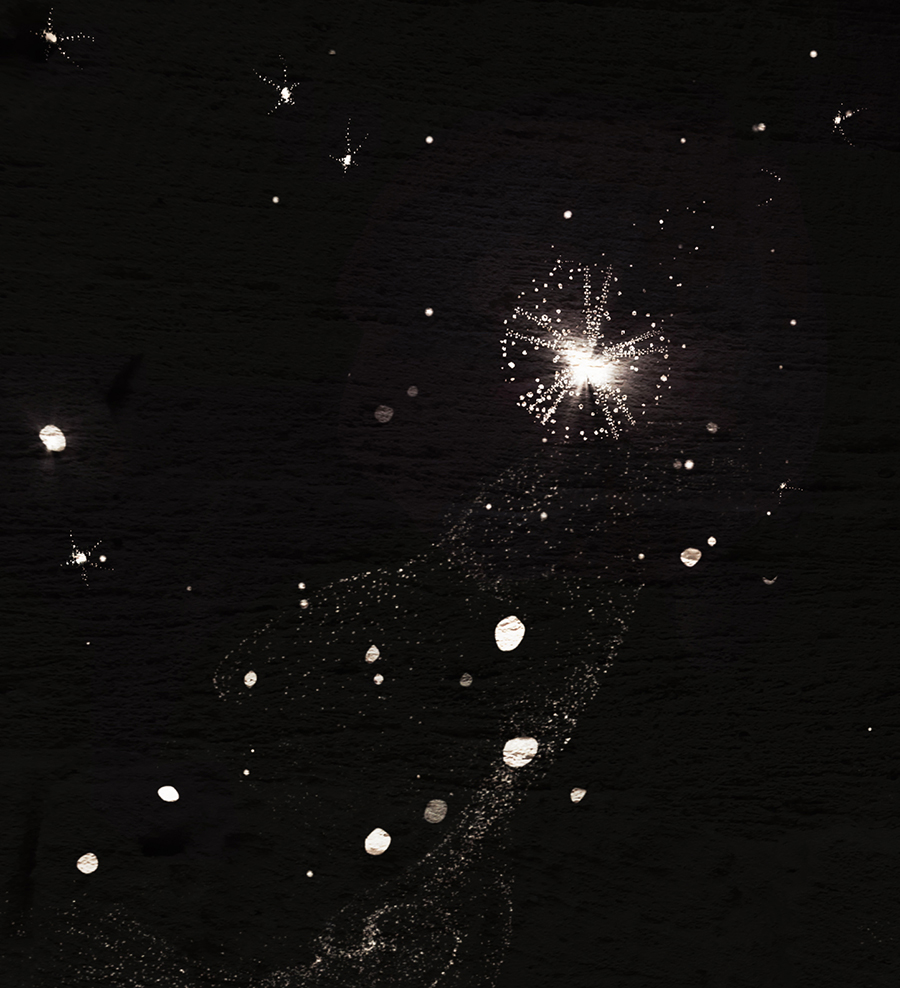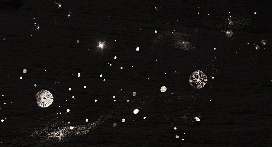 Les fossiles en volume intégrés dans le falun se révèlent à la manière de constellations lumineuses avant de s’extraire des parois, semblant reprendre vie avant de se décomposer en nuage de points blancs. Ce ballet lumineux formé par « l’envol de fossiles » conduira le visiteur vers les constellations